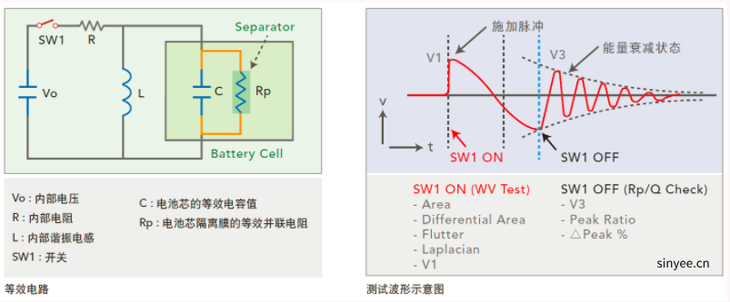 諧振波形中的第三個(gè)電壓峰值。當(dāng)電池芯正負(fù)極板之間的絕緣不良或是隔離膜不存在時(shí),在足夠的電場(chǎng)強(qiáng)度/電壓下會(huì)造成放電,能量的釋放會(huì)導(dǎo)致第三個(gè)電壓峰值的電壓比良品低。當(dāng)電池芯的絕緣品質(zhì)較差時(shí),因?yàn)槟芰繐p失的較快也較多,也會(huì)導(dǎo)致第三個(gè)電壓峰值的電壓比良品低。