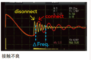 顫動(dòng)量偵測(cè)可以用來做接觸檢查。顫動(dòng)量偵測(cè)是利用一階微分的計(jì)算方式計(jì)算出波形所產(chǎn)生的總量,由于當(dāng)沒有碰觸好或是沒有接到待測(cè)物做測(cè)試時(shí),電容量會(huì)比有接到待測(cè)物時(shí)還要小很多,所以波形諧振的頻率會(huì)非常高,導(dǎo)致波形的總量變大,因此可利用此特性來做接觸檢查的判斷。