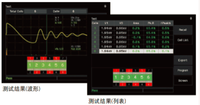 · Chroma 19311系列可透過內(nèi)部電感與電池芯的諧振波形來分析電池芯的絕緣品質(zhì)差異。檢測(cè)的判定功能共有8種:面積比較(Area)、面積差比較(Diff-Area)、顫動(dòng)量偵測(cè)(Flutter)、二階微分偵測(cè)(Laplacian)、第一電壓峰值判定(V1)、第三電壓峰值判定(V3)、波峰比(Peak Ratio)及波峰差比(ΔPeak %)。