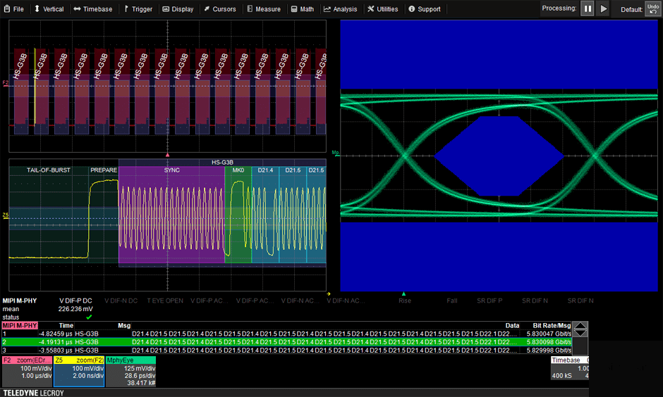 將問題與其根本原因聯系起來通常需要查看多個域中的信號。 這 WaveMaster 8Zi-B 允許您將多種分析類型組合成一個單一的相關顯示:模擬信號、協議解碼、眼圖、測量參數和其他相關信息并排實時顯示。