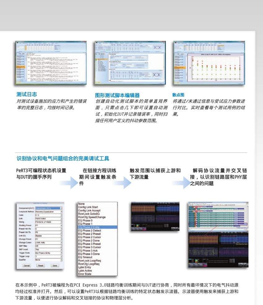 PeRT3 (具有協議使能功能的接收機和發射機容限測試儀)填補了物理層測試和協議層測試之間的空白,為接收機測試和發射機測試提供了更新穎的、更智能化的測試能力。該產品主要是針對于串行數據的收發系統以及其他高速串行信號的通信系統。力科的PeRT3不僅僅是一款新的儀器,更是代表了一類具有完整的新的概念的測試儀器。