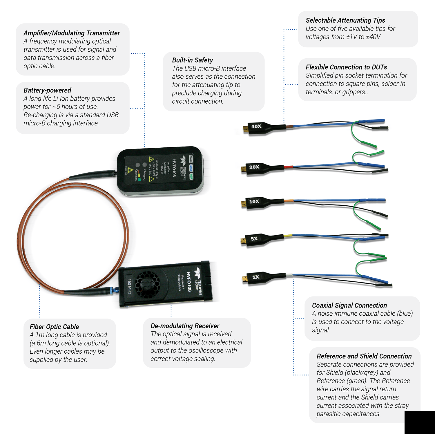 HVFO108-高壓光纖探頭,帶寬為150 MHz。包括軟手提箱。需要衰減尖端(單獨訂購)。包括數量。1 1m光纖電纜。 |